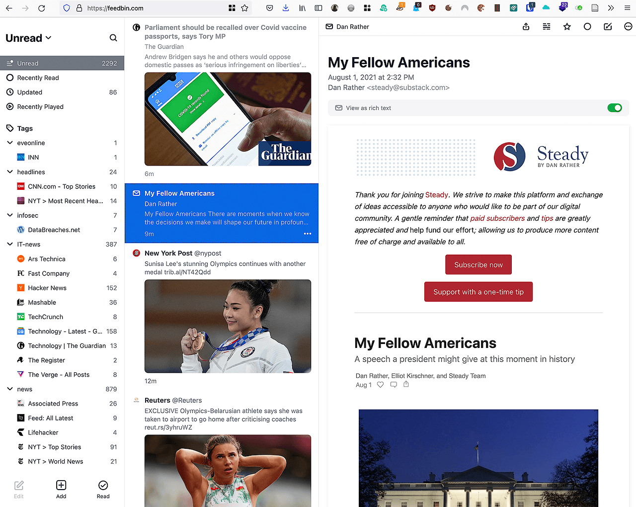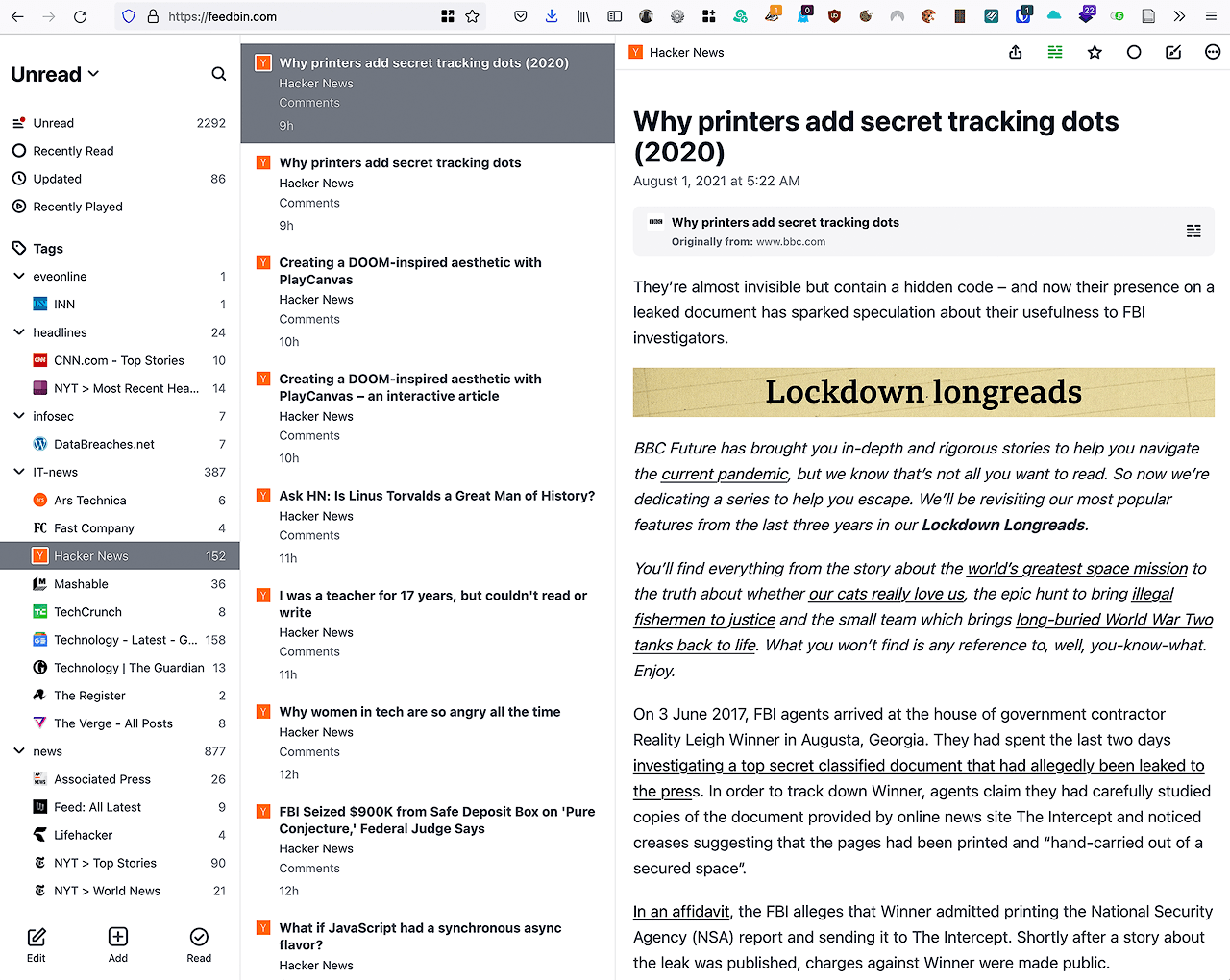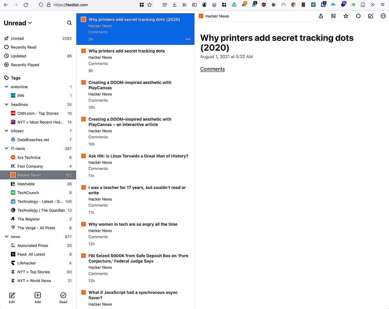 And, finally, the news letter thing: I get a secret email address for Feedbin. If I swap out my email address for various news letters to that address, the mails come in to Feedbin, and perhaps as importantly, out of my mail inbox, decluttering my mail clients.