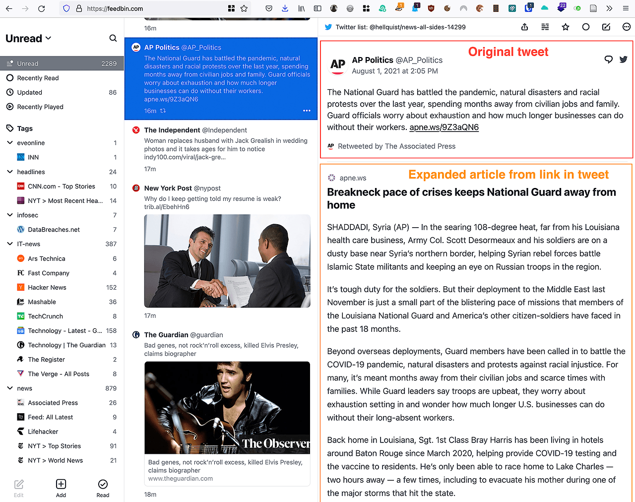 What I couldn’t get in Feedly though was Twitter lists. Well, I could in Feedly too, if I subscribed to “Pro+” (for a higher subscription cost) as opposed to the subscription I had, “Pro”, which was the only subscription option when I went for it. Feedbin handles tweets and Twitter lists just fine though. It even shows you the original tweet but more importantly goes out to fetch the article that is linked to from that tweet, which is great.