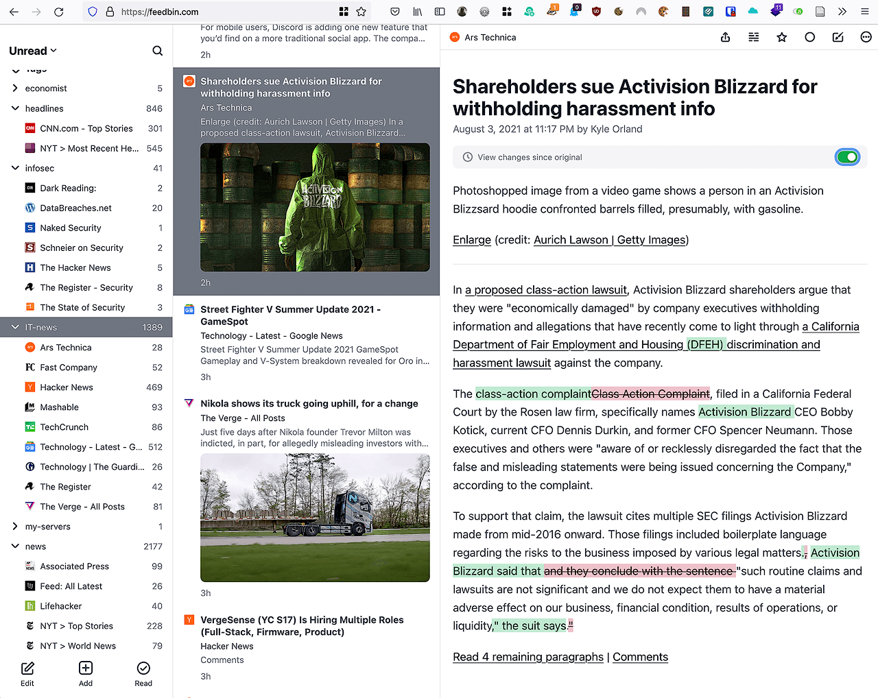 One interesting feature in Feedbin is that it also keeps track of changes to the articles. This means I can see what has changed or been corrected within the article content.
