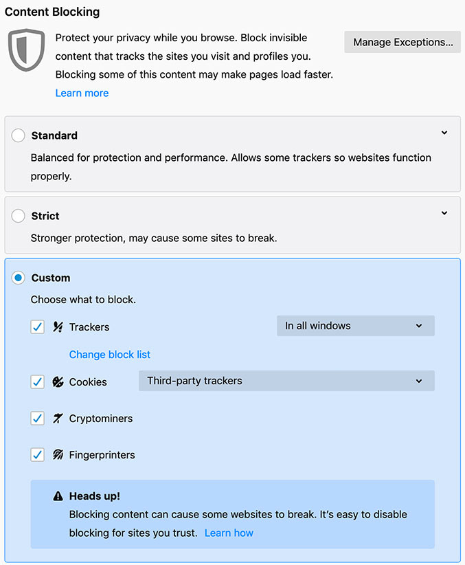 I guess that is the same as the "Strict" setting, but with custom it feels easier to control with more granularity, and to set exceptions, etc, especially as some sites/services need “Third-party trackers” to function (Medium.com, I’m looking at you). If you depend on such a site/service you might wish to set it to the next level “down” in those settings, to avoid having to go in there to adjust it on a daily basis.
